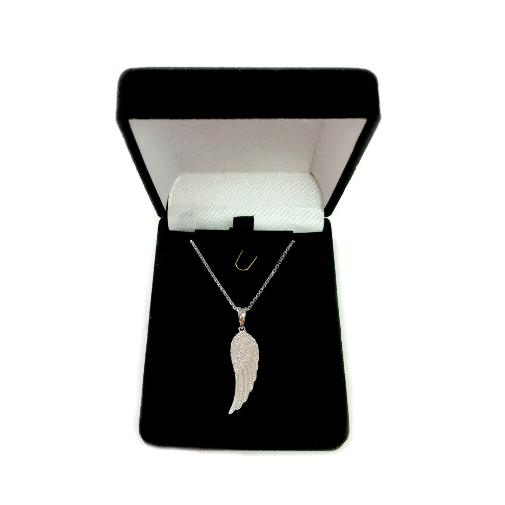 Accentuate a heavenly style look with this angel wing pendant. Finely crafted with 925 Sterling Silver this pendant is rhodium plated for an imperial look and better tarnish resistance. Polished to a brilliant shine, this angel wing pendant slides centered along an 18 inch diamond cut cable chain that secures with a lobster lock clasp.
