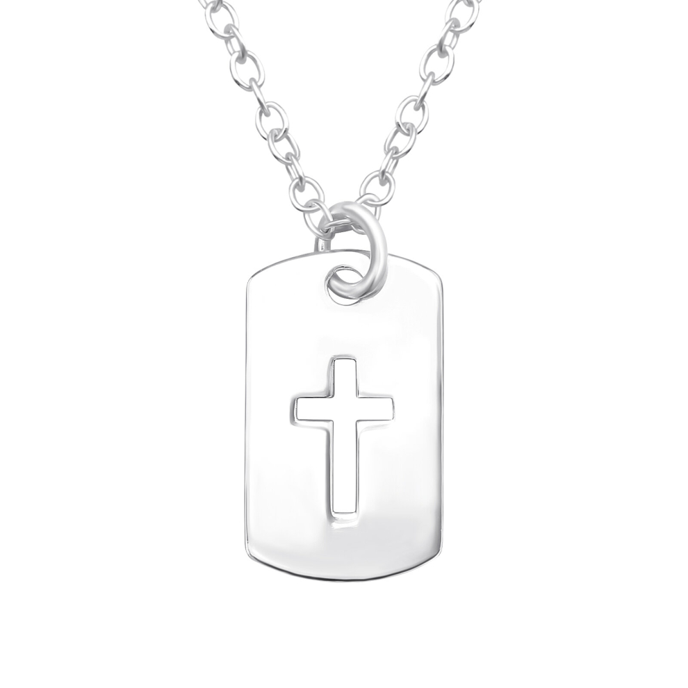 Add a touch of elegance to your outfit with this stunning Sterling Silver laser cut Cross Dog Tag Necklace. Crafted from high-quality 925 Sterling Silver, this necklace features a unique dog tag pendant with a stylish cross design.