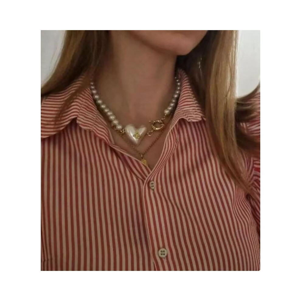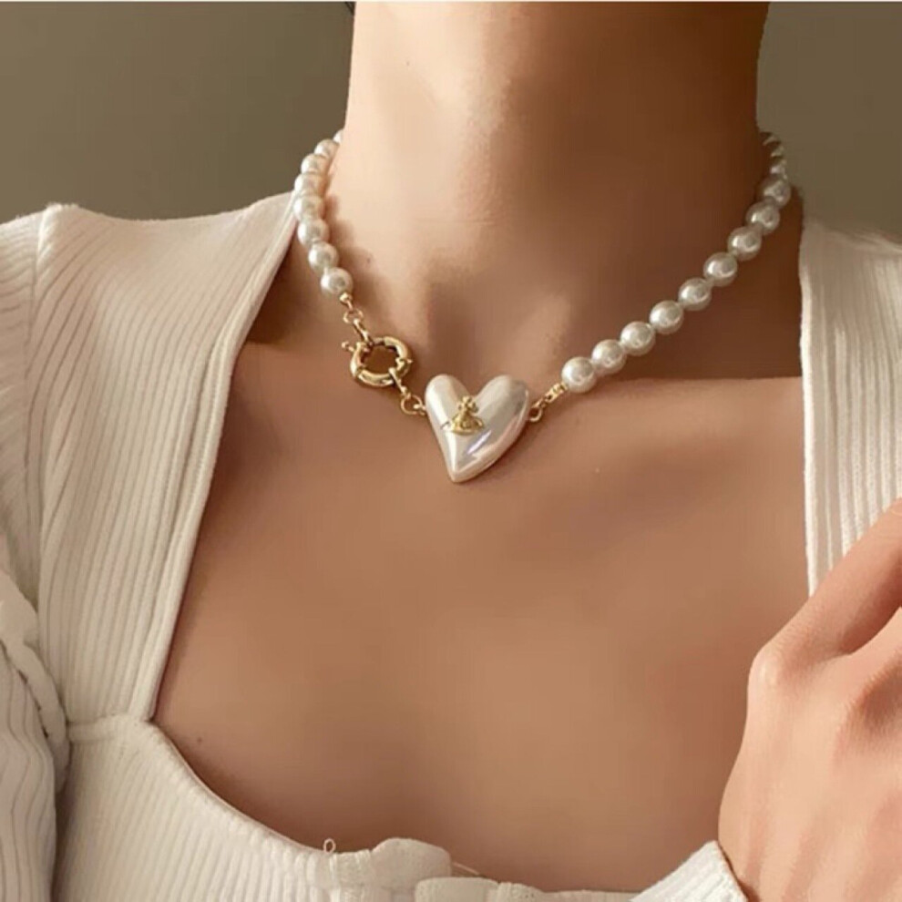 Vivienne Westwood Retro style necklace, Saturn Orb Planet Choker, Heart chainmail choker, Large Pearl Orb Heart Chocker Necklace, jewelry gift, gift for her