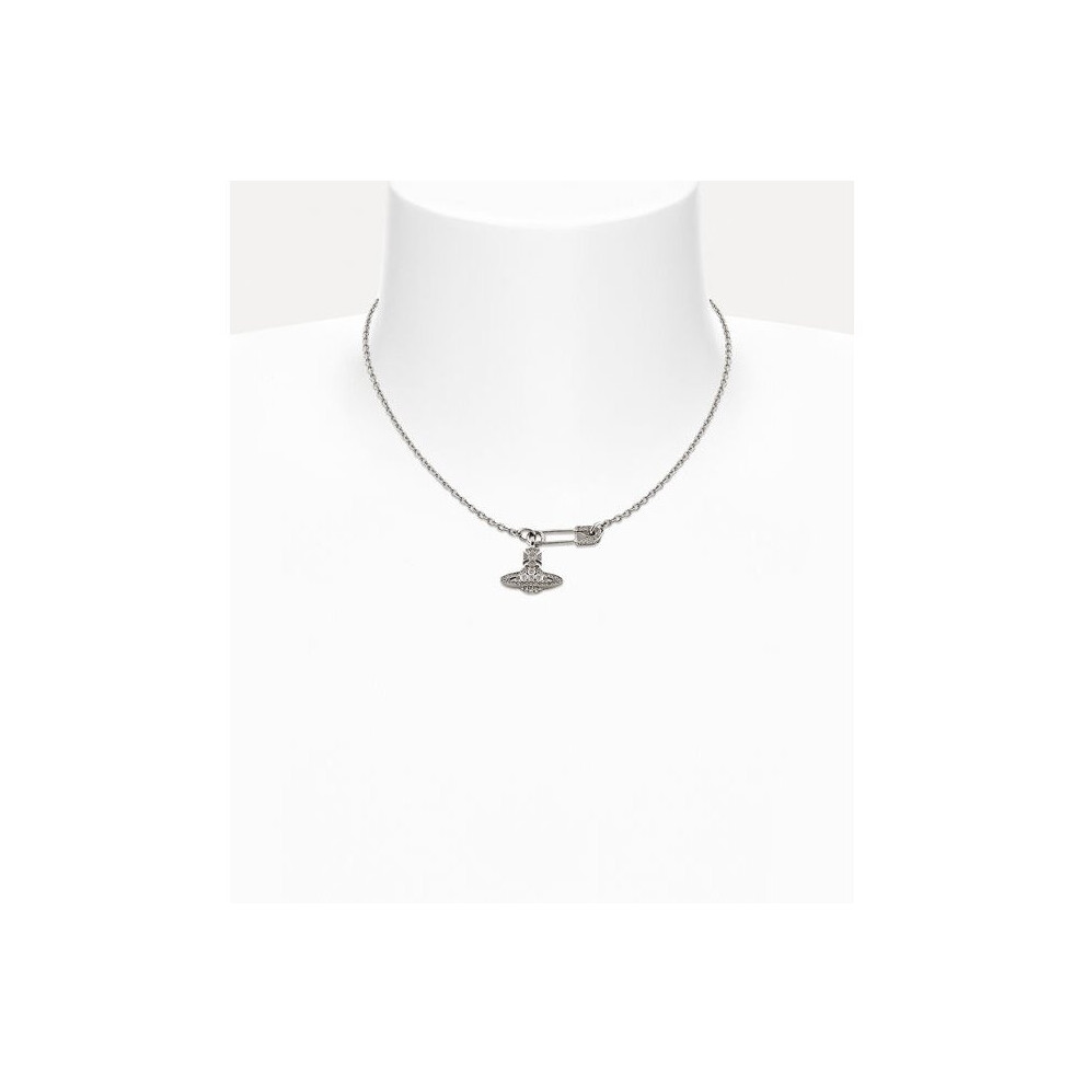 The silver-tone Lucrece pendant necklace has a crystal-encrusted orb and safety pin motif in the centre of the extendable chain.