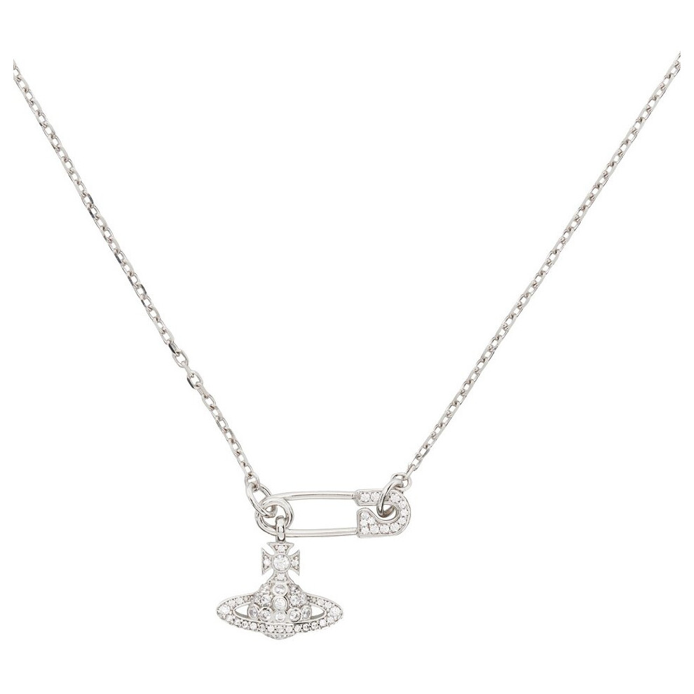 The delicate Lucrece Necklace features the timeless Orb and classic, punk-inspired safety pin, both of which are encrusted with glistening cubic zirconia crystals. Metal: Brass/Rhodium plated. Chain length: 40-44cm (approx)