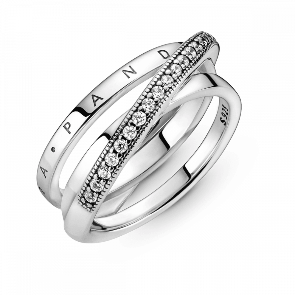 Make a statement with the Go for Linear Layers with the Crossover Pav© Triple Band Ring, a sterling silver marvel designed to captivate. With three bands skillfully crafted to intertwine, this ring boasts a modern and sophisticated aesthetic. The unique design features one band elegantly crossing over the other two, creating a dynamic and eye-catching look. Adorning the inner bands are the iconic Pandora logo and a smooth polished finish, while the outer band dazzles with the brilliance of clear cubic zirconia pav© nestled within intricate micro-beading. Inspired by the celestial beauty of the spiral structure of the solar system, this ring exudes a sleek and structural charm that adds an element of refinement to any ensemble.
