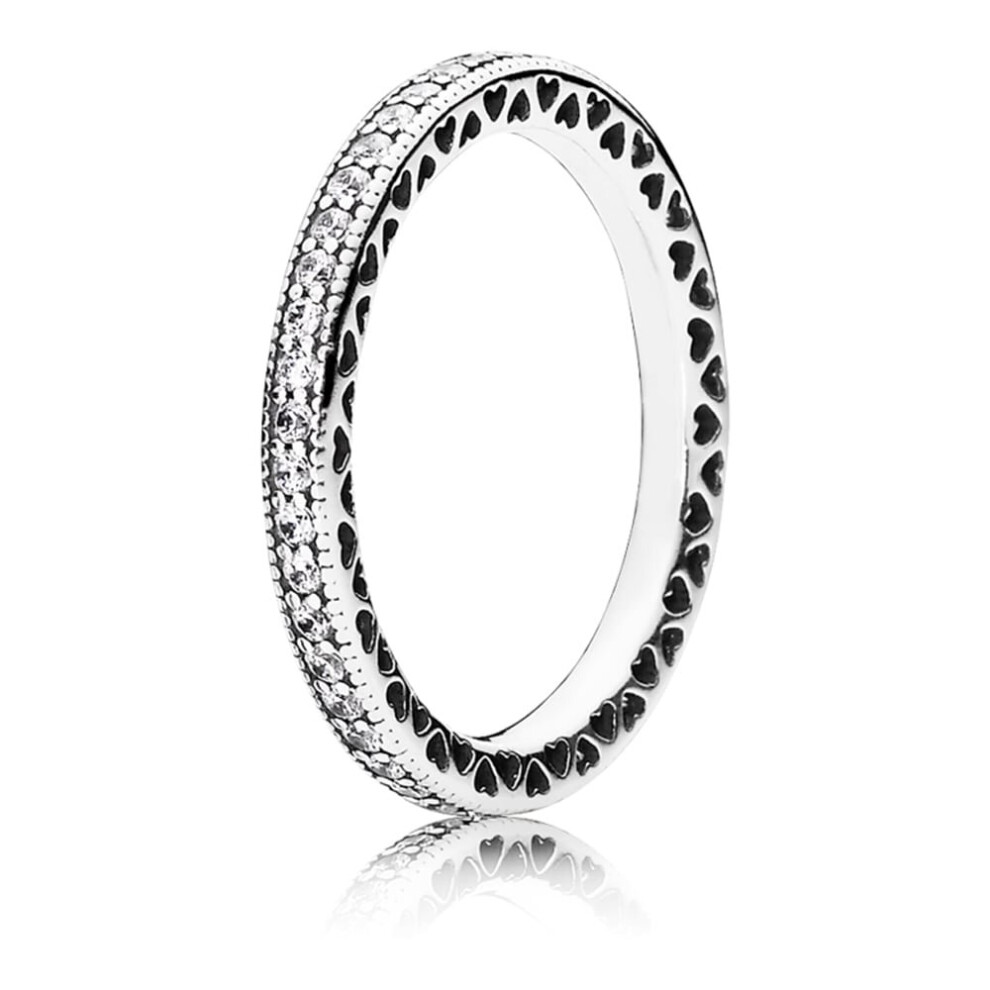 Express your heart’s true desire with this sparkling eternity ring. Hand-finished in sterling silver, this elegant style beautifully combines dazzling cubic zirconia stones with delicate cut-out hearts. Showcase it on its own or mix and match with other Pandora stackable rings for a chic play on textures.